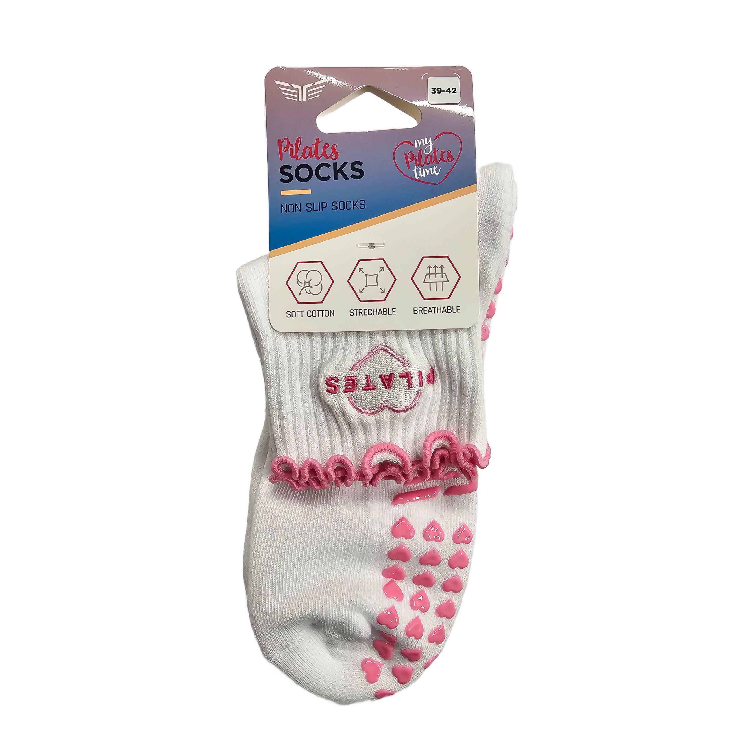 Odkrij vrhunske Pilates nogavice Love, ki zagotavljajo popolno stabilnost in udobje med vadbo. Te elegantne bele nogavice z nežnimi rožnatimi detajli in srčki na podplatu niso le praktične, ampak tudi stilsko dovršene.